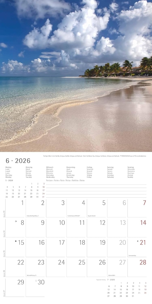 Wall calendar with photographs of the world’s most beautiful places by the sea. A Wish list and a Birthday register are included at the beginning of the calendar.