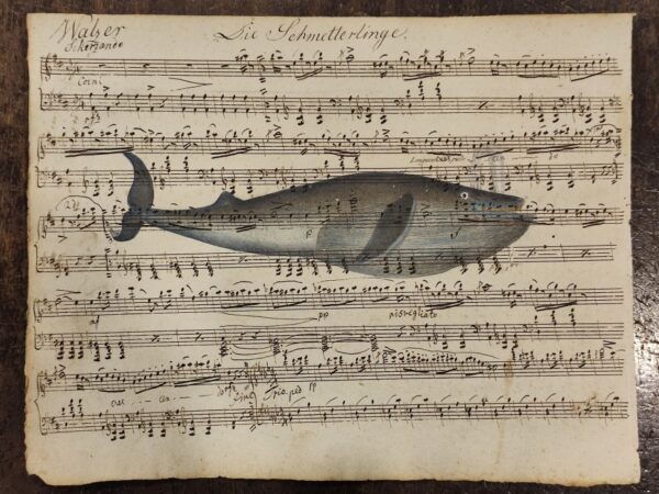 Reproduction of an antique print engraved with a hand press and watercolored by expert painters on ancient musical score.