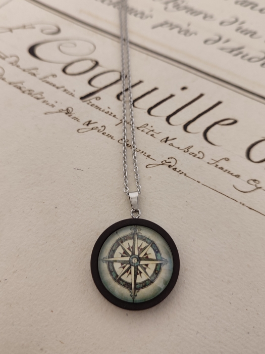 Ciondolo ecosostenibile in legno di mogano, carta, vetro e collanina in acciaio inossidabile ipoallergenico.