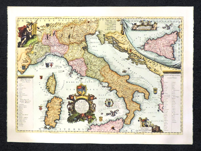 Questa riproduzione di una stampa antica (originale di Coronelli) è stata impressa con il torchio a mano su carta pregiata e acquarellata a mano da pittori esperti.