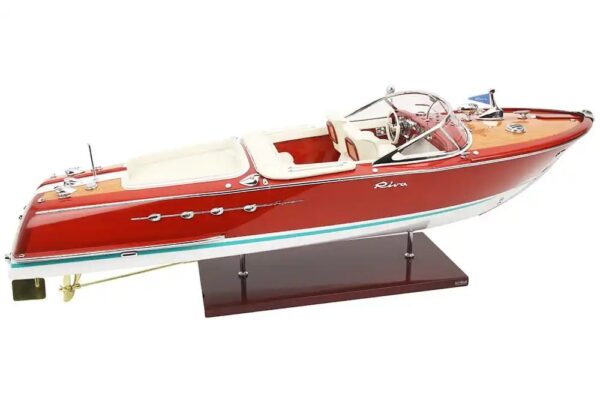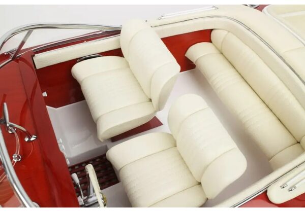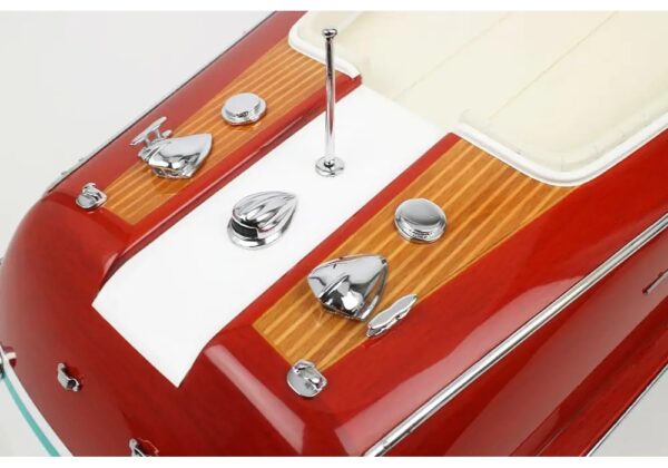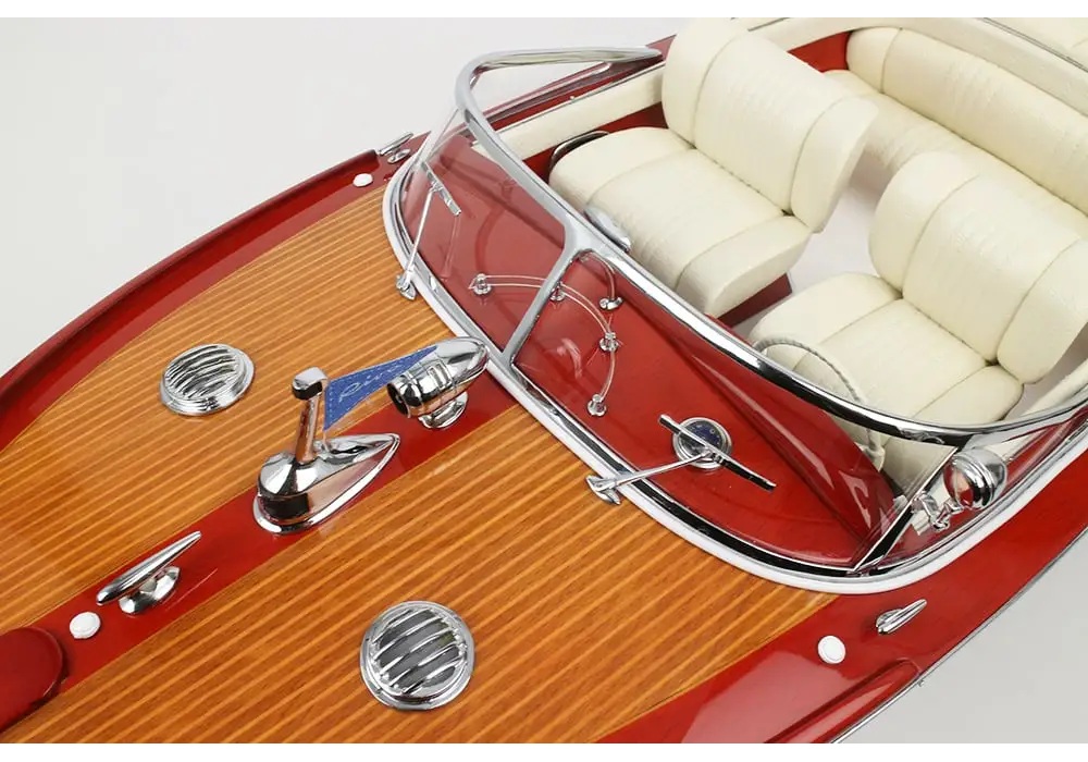 A truly exceptional object: this exclusive official model of the Riva Aquarama was created in collaboration with the Riva shipyard. It is a faithful replica of the legendary Aquarama, entirely handcrafted with high-quality materials: fine woods and authentic nautical upholstery. All accessories are custom-made in chromed brass by expert jewelers. Ten layers of varnish are applied to obtain excellent shine and depth, for an exceptional finish.