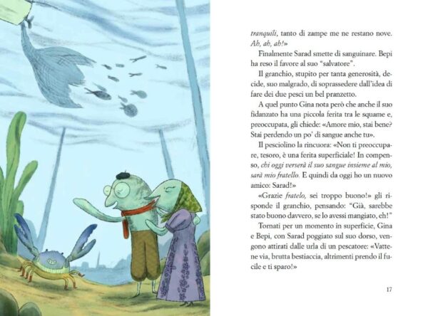 Un giorno, mentre nuotano tranquillamente lungo i canali della laguna di Venezia, sono prelevati all’improvviso da un gigantesco uccello di metallo giallo. Poco dopo il Canadair li scarica insieme all’acqua e finiscono in un torrente sulle Alpi.