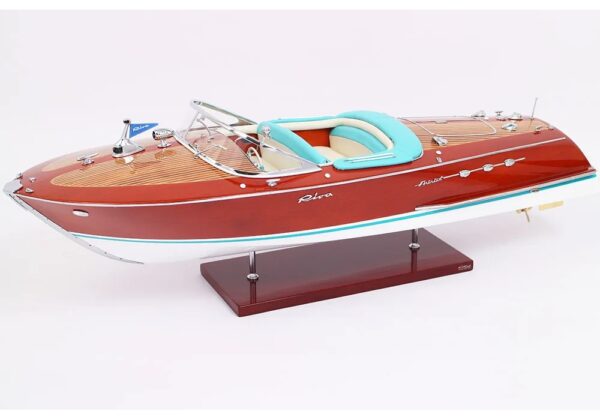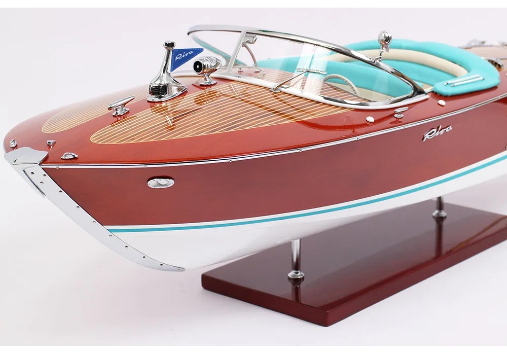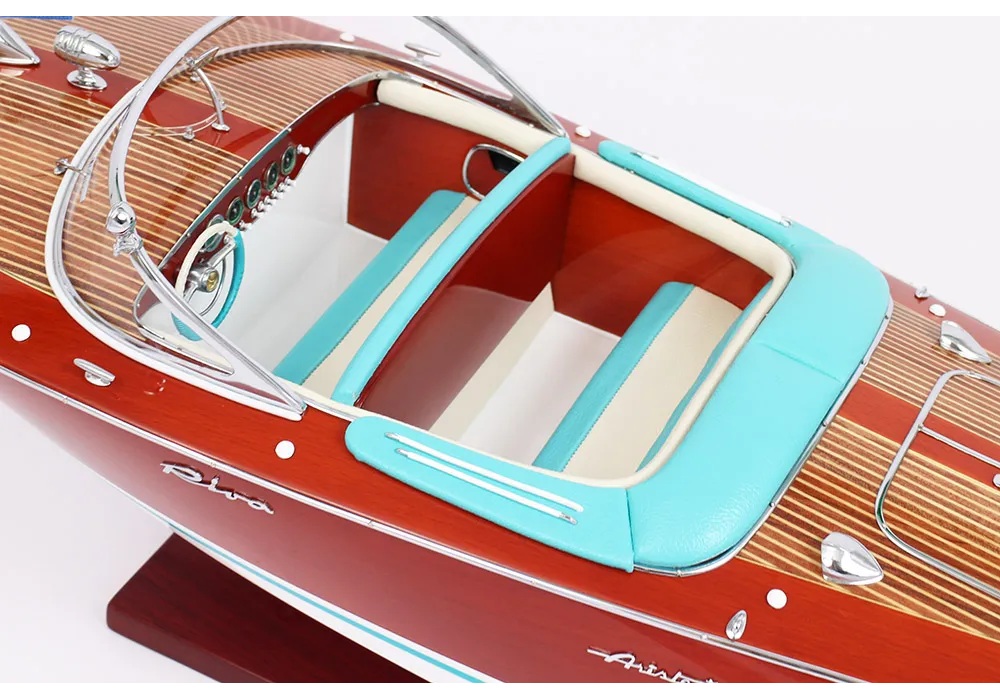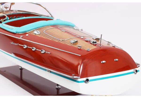 A truly exceptional object: this exclusive official model of the Riva Ariston was created in collaboration with the Riva shipyard. It is a faithful replica of the legendary Ariston, entirely handcrafted with high-quality materials: fine woods and authentic nautical upholstery. All accessories are custom-made in chromed brass by expert jewelers. Ten layers of varnish are applied to obtain excellent shine and depth, for an exceptional finish.