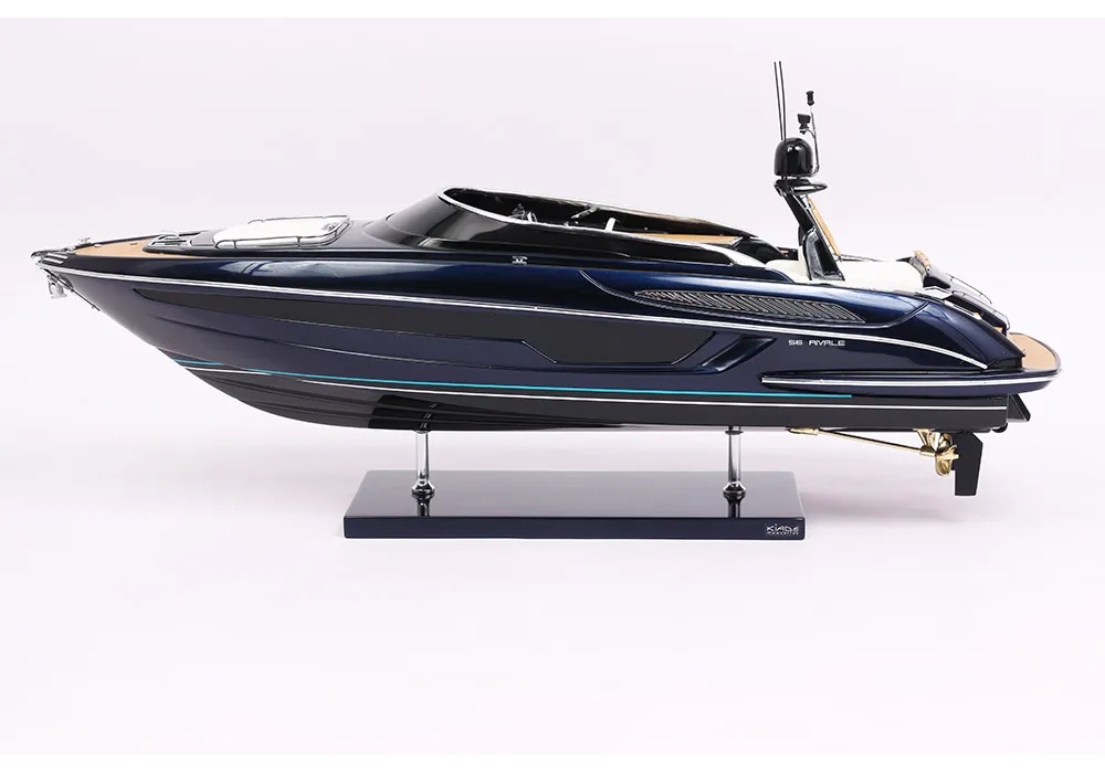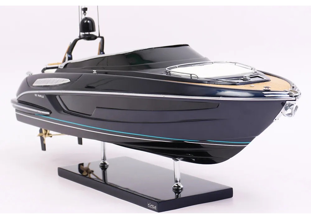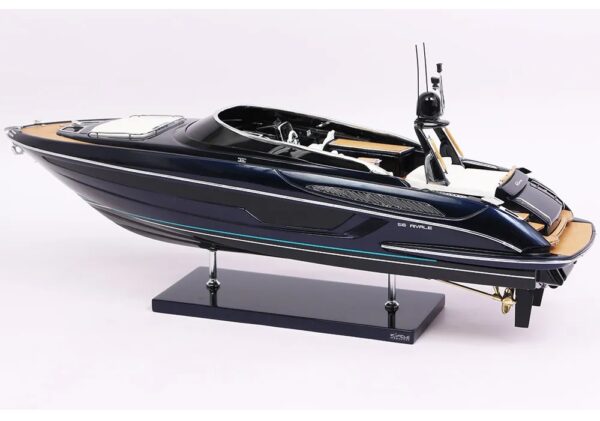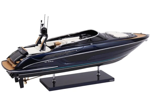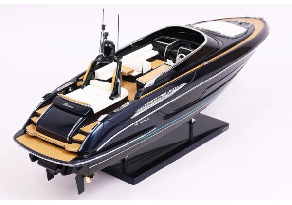A truly exceptional object: this exclusive official model of the Riva Rivale was created in collaboration with the Riva shipyard. It is a faithful replica of the legendary Rivale, entirely handcrafted with high-quality materials: true fiberglass and authentic nautical upholstery. All accessories are custom-made in chromed brass by expert jewelers. Ten layers of varnish are applied to obtain excellent shine and depth, for an exceptional finish.