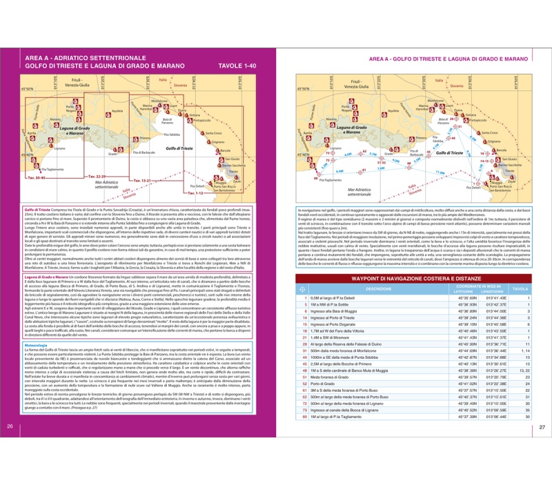 La principale caratteristica di questo portolano, studiato per programmare itinerari a breve raggio, sono le 90 tavole cartografiche che illustrano tutti i porti, marina e ancoraggi dell’area di navigazione. Il presente volume comprende le coste dell’Adriatico settentrionale con il Golfo di Venezia e il Golfo di Trieste. Molto dettagliata la descrizione di porti e approdi particolarmente numerosi nell’alto Adriatico, includendo tutte le norme che ne regolamentano la navigazione.
