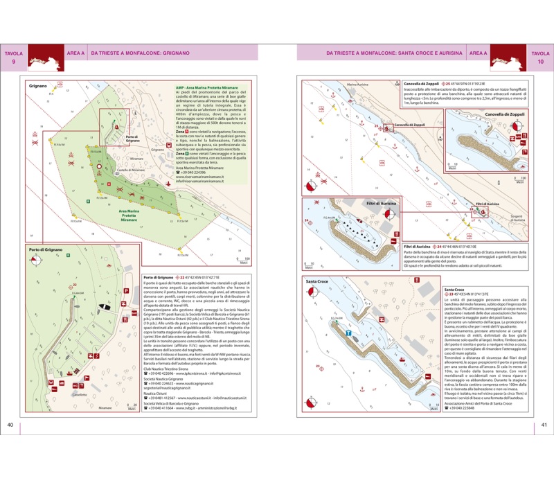 Nelle guide rapide di consultazione all’inizio di ogni capitolo sono elencati i principali porti e marina, con i relativi servizi (erogazione di acqua e corrente, carburante, assistenza tecnica, ecc.) e le baie idonee all’ancoraggio, con le relative caratteristiche utili al navigante (protezione, natura del fondo, profondità, possibilità di approdo con il tender, ecc.). Basta, dunque, un rapido sguardo per essere in grado di scegliere il porto o la baia a seconda della propria barca e delle condizioni meteo. I numerosi piani di porti e baie sono corredati da una ricca gamma di pittogrammi, che ne facilitano l’immediata consultazione. Brevi testi completano le informazioni di pilotaggio indispensabili per una navigazione sicura. In tutti i piani è presente un’icona che indica i venti di traversia.