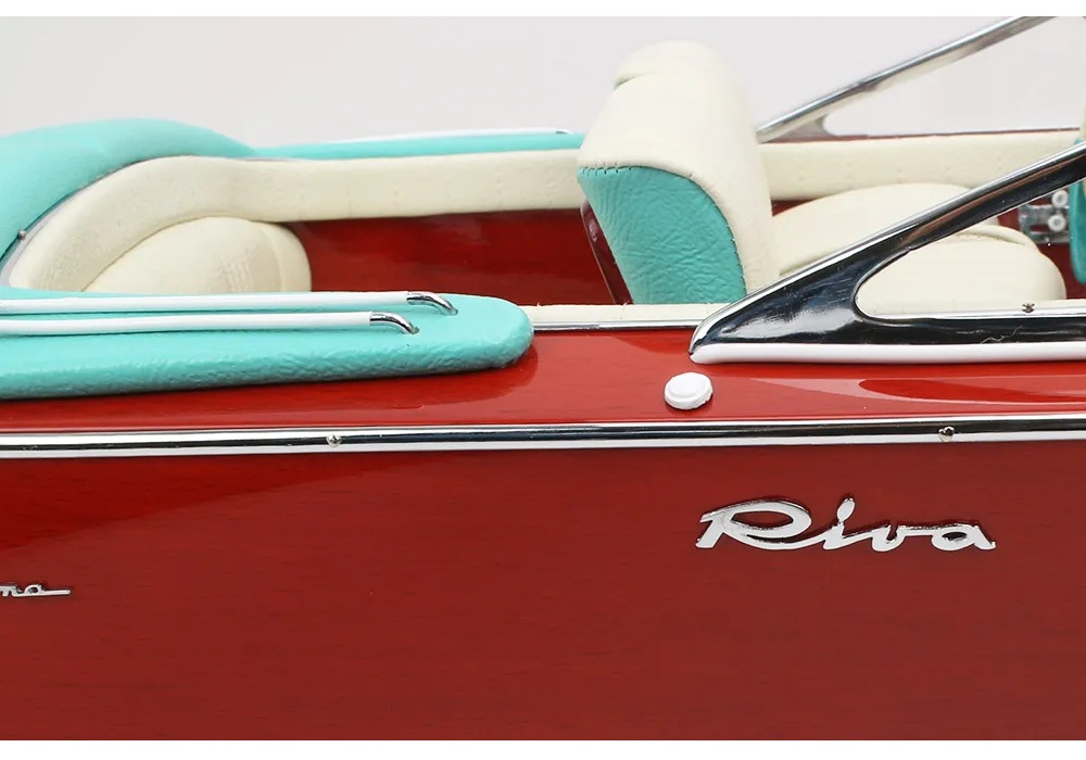A truly exceptional object: this exclusive official model of the Riva Aquarama was created in collaboration with the Riva shipyard. It is a faithful replica of the legendary Aquarama, entirely handcrafted with high-quality materials: fine woods and authentic nautical upholstery. All accessories are custom-made in chromed brass by expert jewelers. Ten layers of varnish are applied to obtain excellent shine and depth, for an exceptional finish.