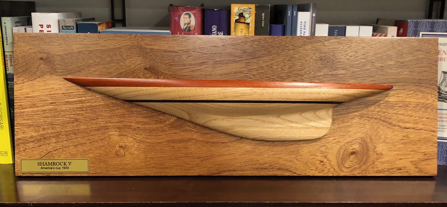 Wooden half hull reproducing the sailboat Shamorck V in 1930, when she raced in the America’s Cup.