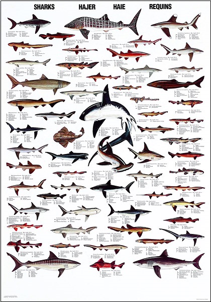 Shark Poster that shows 60 of the most common sharks in the world, e.g. whale shark, whitetip shark, and izak shark.
