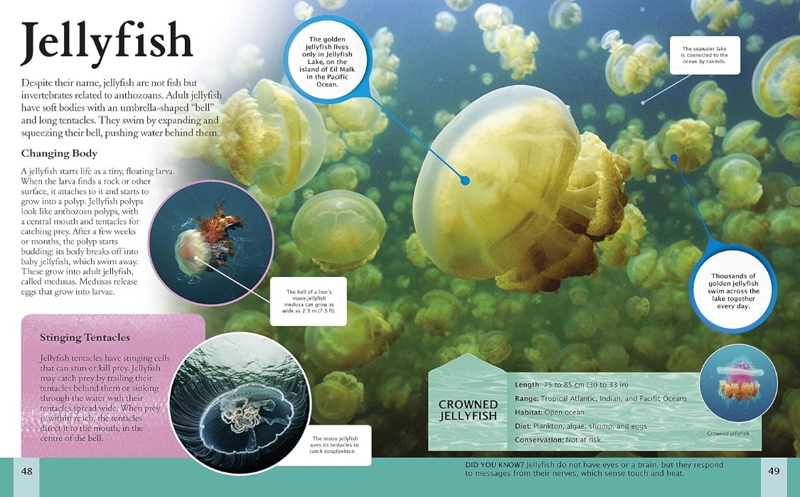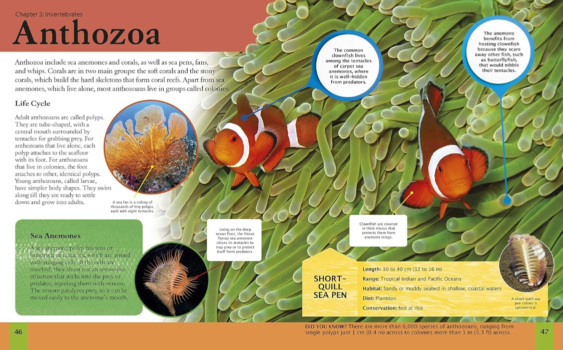 Full of fascinating facts and stunning sea life photography, this book covers everything from the ocean shores to deep sea creatures. Find out why octopuses release ink, why clownfish live in anemone tentacles and where can you find a halloween crab.