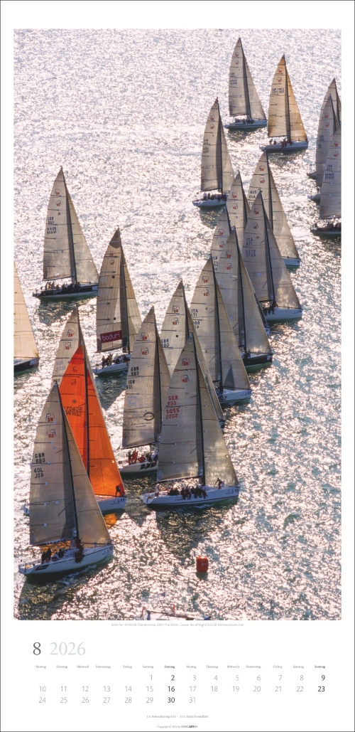 Wall calendar featuring a selection of photographs of vintage and modern sailboats, depicting dynamic maneuvers and fluid glides, in a vertical format that’s easily adaptable even to small spaces.