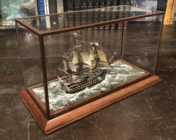 Modified Revell model of the sailing ship Victory set in a marine diorama, with wooden base and plexiglass case.