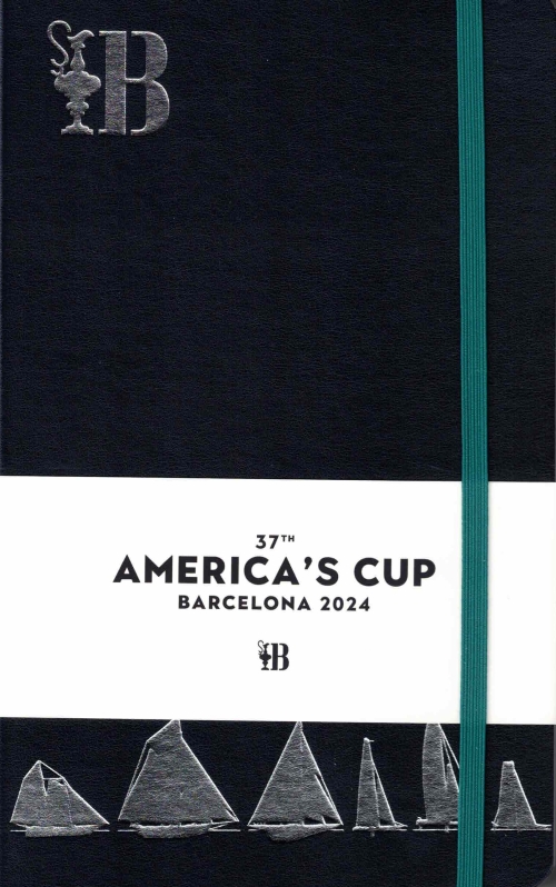 Quaderno a righe prodotto in occasione della 37° edizione della Coppa America, svoltasi a Barcellona nel 2024. La legatura editoriale in brossura nera è impreziosita dalle impressioni argento al piatto anteriore. Gli angoli stondati e l’elastico verde evidenziano la qualità del quaderno, stampato dall’editore catalano Lupita che ha confezionato molti altri prodotti ufficiali per la Coppa America. I risguardi illustrati in verde e il segnalibro in tessuto arancione sono gli ultimi dettagli che rifiniscono il quaderno.