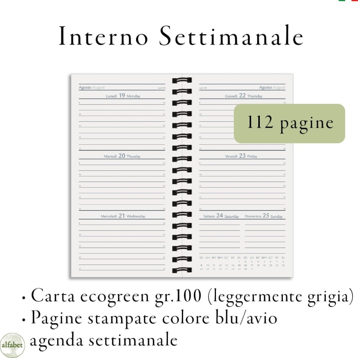 Agenda settimanale in carta Pure rilegata a spirale. Pure è una carta da 100 grammi fatta con il 100% di fibre riciclate, prodotta senza abbattimento di alberi. La copertina è realizzata, invece, in EcoVinx, un materiale a base di cellulosa e fibre riciclate post-consumo, con aspetto simile alla pelle e al tessuto. Ecologica e resistente, questa carta speciale non è impermeabile, ma si può lavare con una spugna e un sapone delicato. EcoVinx è Made in Europe e il produttore è certificato FSC.