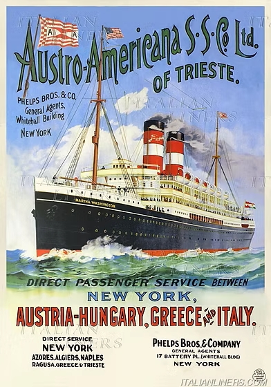 Riproduzione di un bel poster del 1910 stampato dalla Modiano di Trieste per il mercato nord americano; l’illustrazione del transatlantico Martha Washington era opera di Giuseppe Sigon.