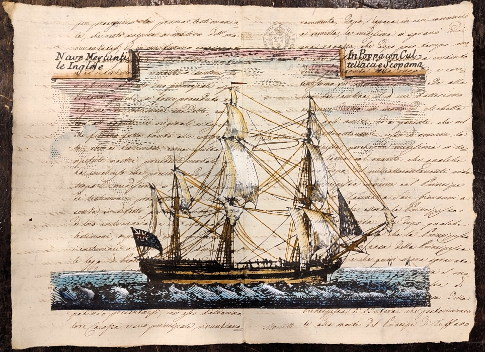 Foglio di carta antica originale con testo recto e verso, su cui è stata impressa con il torchio a mano la riproduzione di una stampa antica acquarellata a mano da pittori esperti.