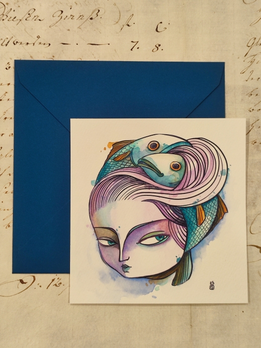 Biglietto stampato su cartoncino e acquarellato a mano.
