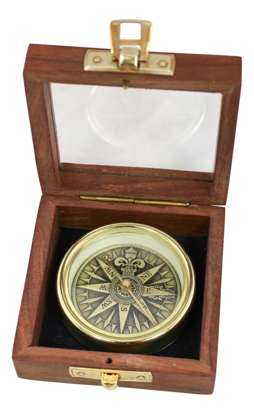Bussola fermacarte in ottone con rosa dei venti tridimensionale. Scatola in legno e coperchio in vetro, foderata in velluto blu.