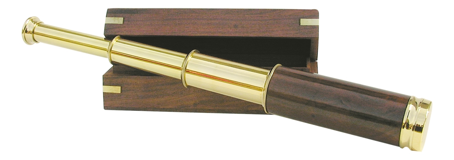 Cannocchiale in ottone con impugnatura in legno. Scatola di legno con intarsi in ottone, foderata in velluto blu.
