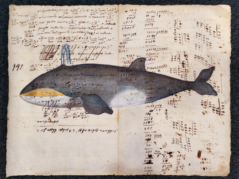 Foglio di carta antica originale con testo recto e verso, su cui è stata impressa con il torchio a mano la riproduzione di una stampa antica, acquarellata a mano da pittori esperti.