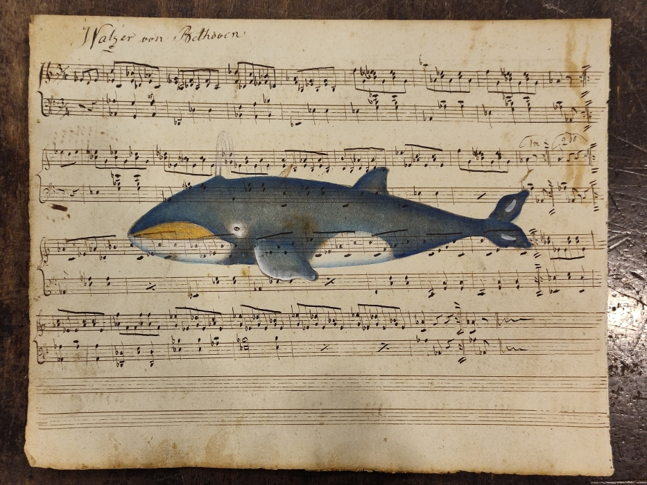 Foglio di carta antica originale con spartito recto e verso, su cui è stata impressa con il torchio a mano la riproduzione di una stampa antica, acquarellata a mano da pittori esperti.