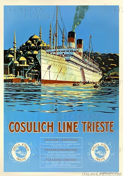 Riproduzione di un bel poster del 1926 stampato dalla Modiano di Trieste; l’illustrazione della nave da crociera Stella d’Italia a Istanbul era opera di Paolo Klodic.