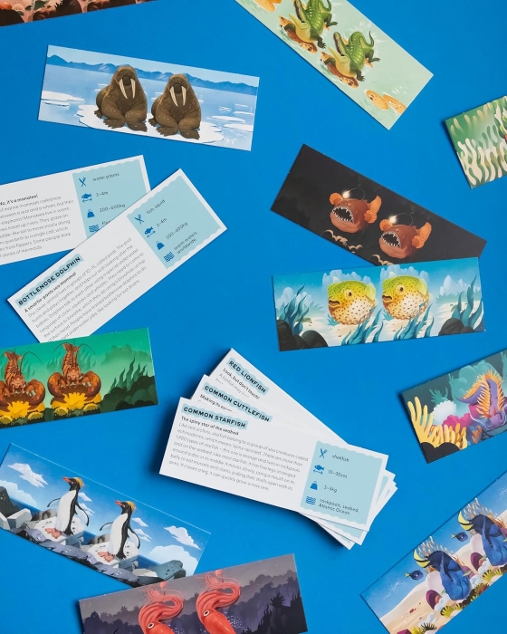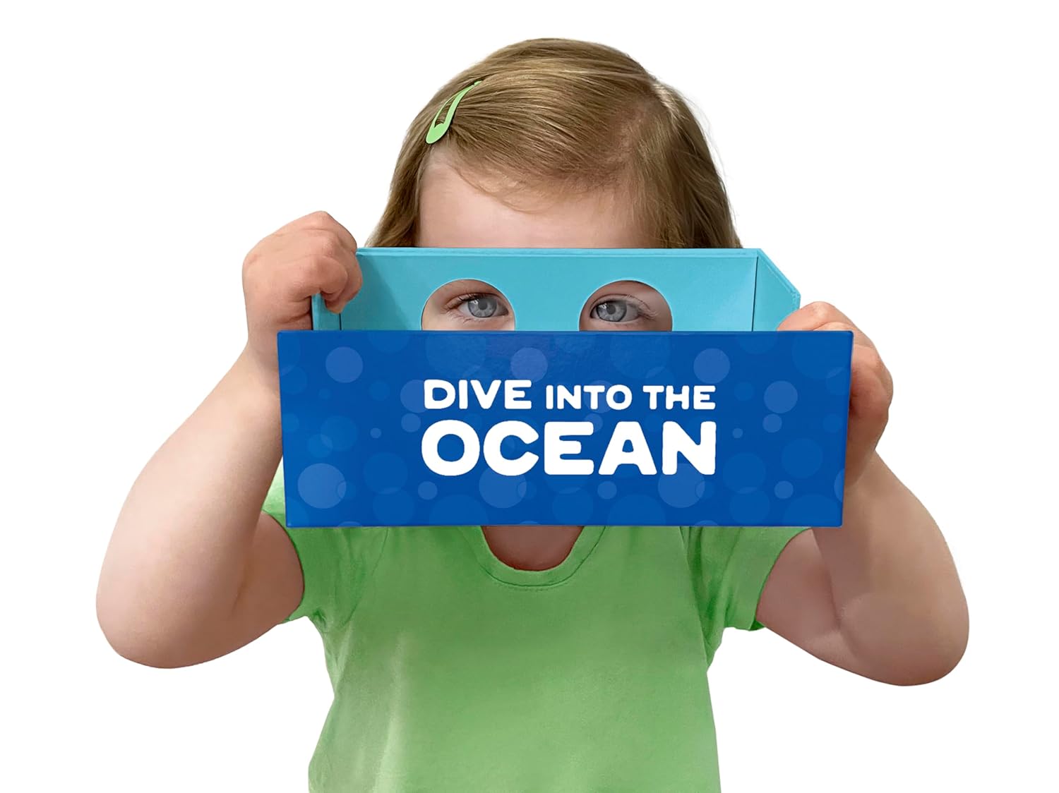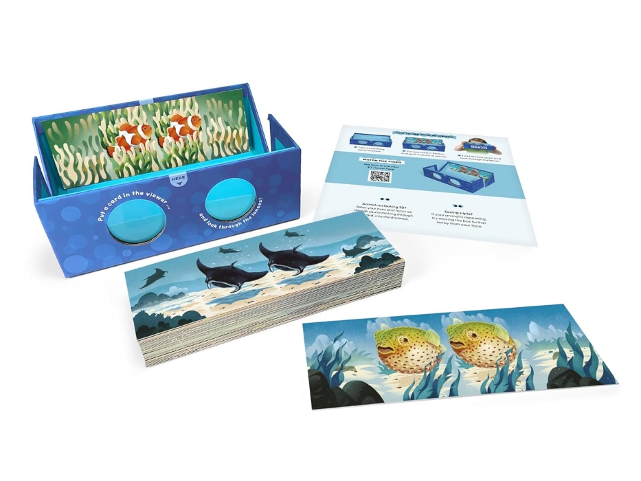 Choose a creature card and place it in the box, then look through the lenses to start your underwater adventure! See a great white shark’s rows of teeth, a clown fish nestled in an anemone, an orca leaping from the water and many other aquatic favourites in three dimensions. Turn over the cards to discover fun facts about each wild and watery creature.