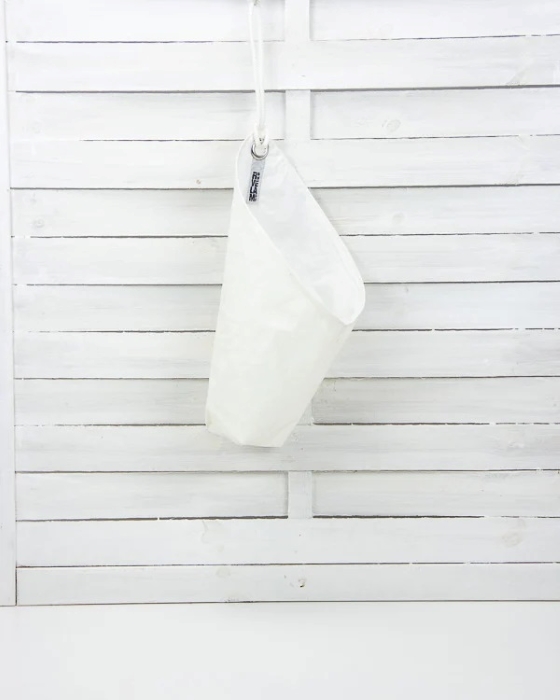 Tutti i prodotti “Rivelami” sono realizzati con vele riciclate al 100%. Ogni creazione è un pezzo unico. Lavabile a mano o in lavatrice max 30°C. Non usare asciugatrice.