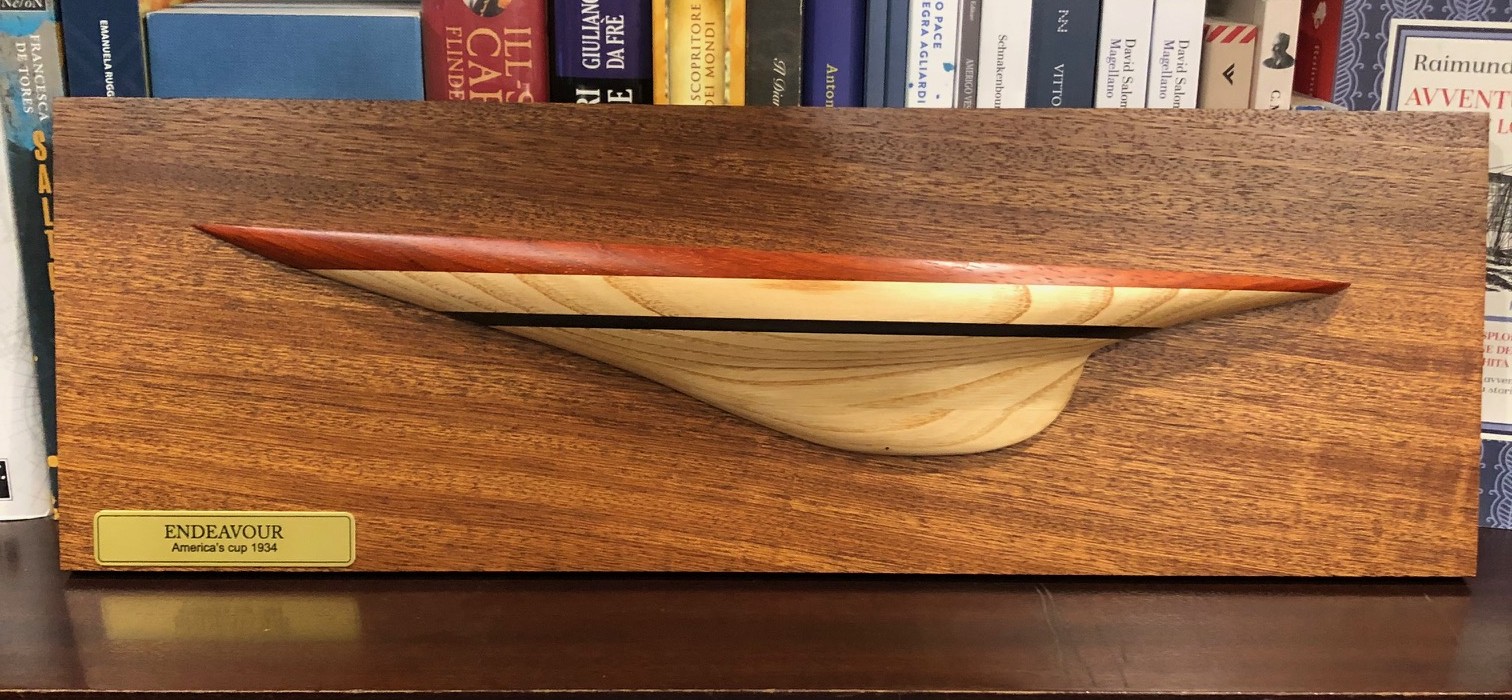 Mezzo scafo in legno che riproduce la barca a vela Endeavour nel 1934, anno in cui partecipò alla Coppa America.