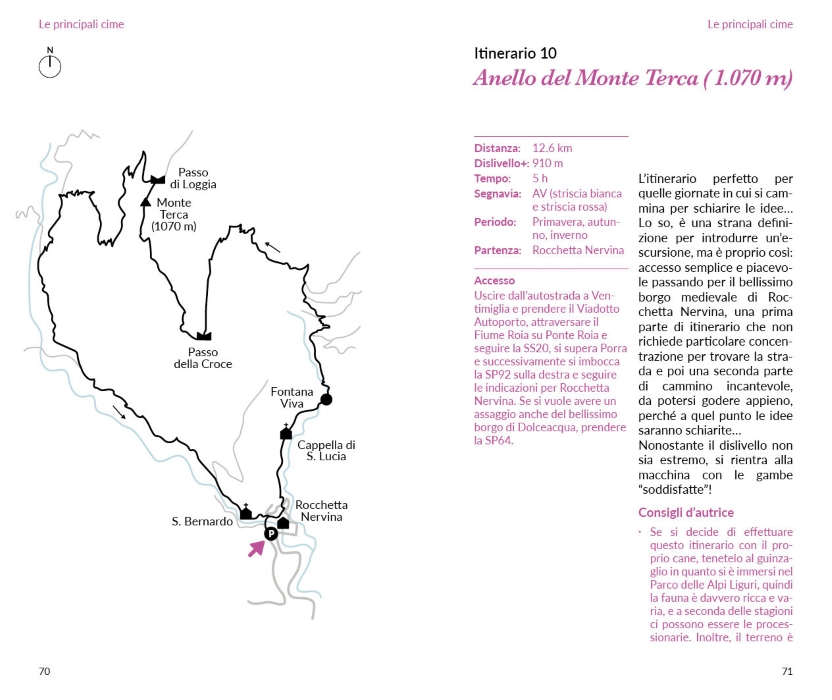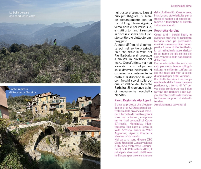 Guida a 17 itinerari a piedi ricchi di curiosità, informazioni, mappe e tante foto: Monte Carmo (1.389 m); Monte Ravinet (1.061 m); Monte Pesalto (686 m) ; Monte Acuto (748 m); Monte Bignone (523 m) e il Sentiero dell’Onda; Forte Liverna (550 m) e Croce di Arnasco (646 m); Castell’Ermo (1.092 m); Rocca Barbena (1.142 m); Monte Saccarello (2.200 m); Anello del Monte Terca (1.070 m); Strapatente Tour, di grotta in grotta con giro ad anello; Finalborgo, Verezzi e anello per la Vecchia Cava; Il Sentiero del Pellegrino; Il Sentiero di Terry e le grotte finalesi; Rocca di Perti (398 m); I Ciappi; Giro ad anello da Dolcedo ai laghetti di Lecchiore, passando per Valloria.