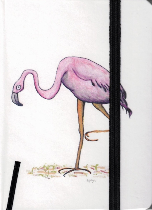 Taccuino con elastico, angoli arrotondati e pagine bianche. Il fenicottero stampato in copertina riproduce fedelmente un disegno originale di Guja Ajolfi.