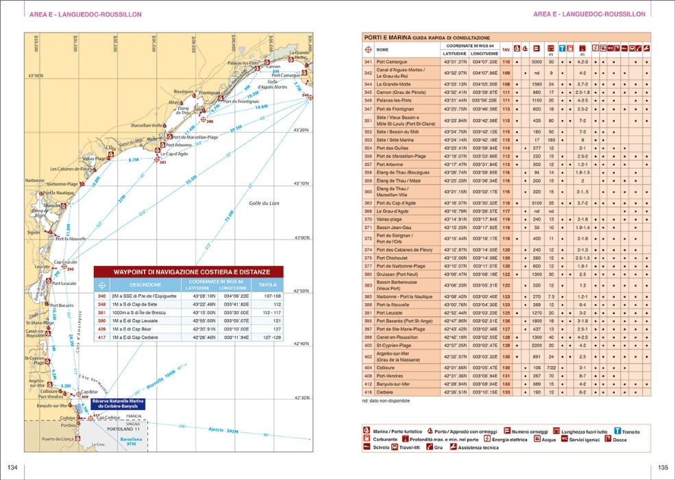 All’inizio di ogni area una guida rapida permette di consultare i principali porti e marina con i relativi servizi (colonnine di acqua e corrente, carburante, assistenza tecnica, contatti, ecc.). Basta dunque un rapido sguardo per essere in grado di scegliere il porto più adatto in base alle caratteristiche della propria barca e delle condizioni meteo.