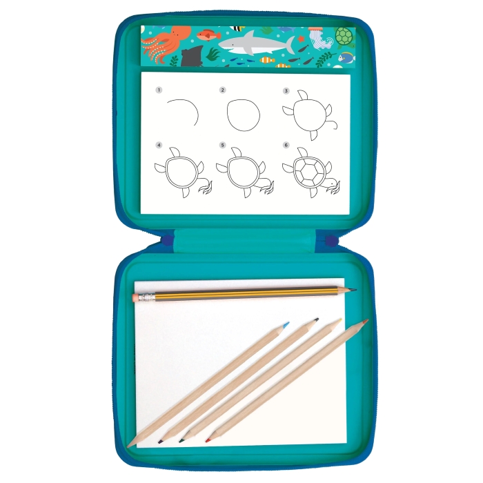 The set includes instructions for drawing 36 different kinds of wildlife that live under the sea, a blank paper pad for your magnificent masterpieces, a lead pencil and four double-ended coloring pencils — that’s eight colors! All the materials come packaged in a magnetic zip-up storage tin, so your little one can make art on the move.