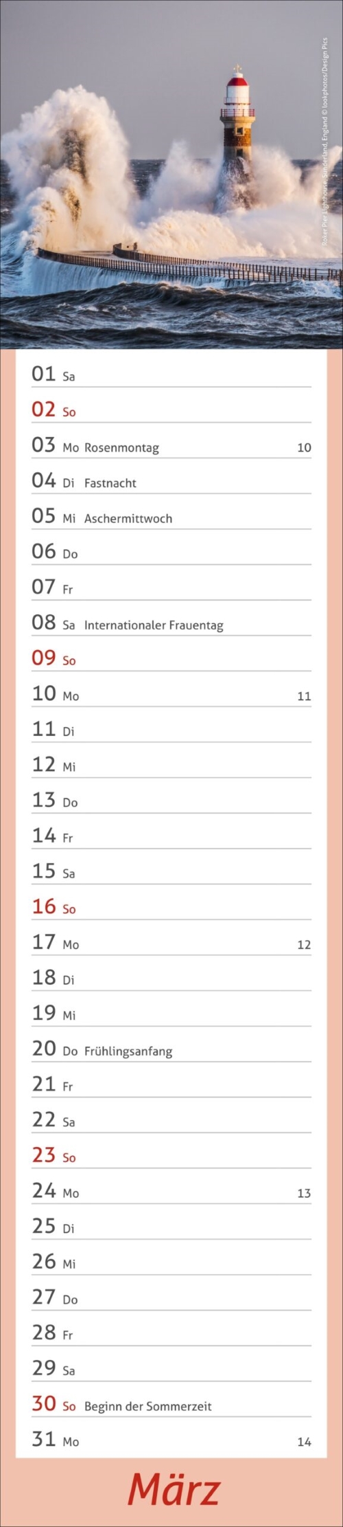Piccolo calendario da parete con graziose fotografie di fari, che offre molto spazio per le annotazioni ed è adatto anche a spazi stretti.