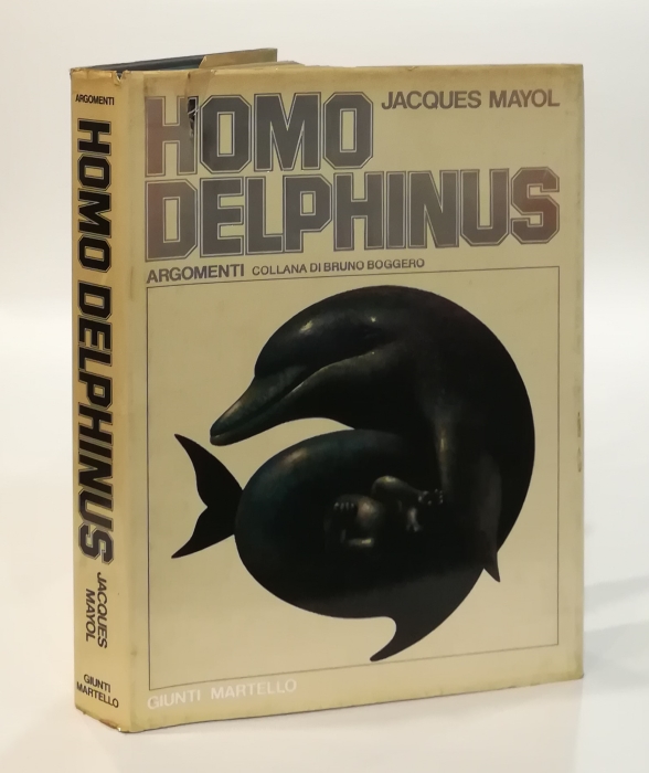 Raro esemplare della prima edizione di Aldo Martello – Giunti Editore del 1979 in ottimo stato di conservazione, collana “Argomenti” 1 (diretta da Bruno Boggero). In-8, legatura editoriale telata blu con impressioni bianche al piatto anteriore e al dorso; sovraccoperta in carta plastificata illustrata a colori con alette con caratteri argentati lucidi in rilievo (strappo al taglio superiore in prima); 380 pp. (numerate erroneamente fino al n. 382), con risguardi azzurri e dedica in pennarello nero al risguardo anteriore; sommario (pp. 10-11 su pagine rosa), segno di penna rossa al taglio inferiore, numerosissime fotografie e illustrazioni in nero e a colori nel testo. Libro meglio noto in italiano col titolo L’uomo delfino.