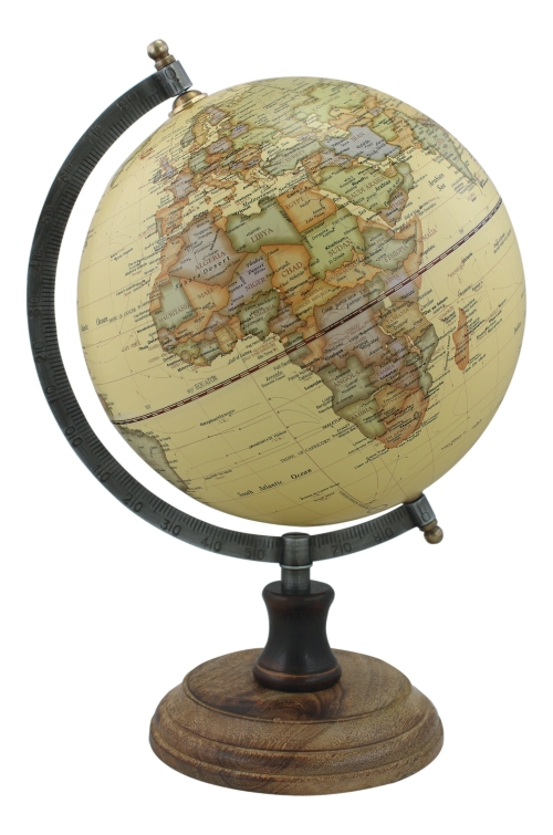 Mappamondo con piedistallo in legno, finitura anticata.