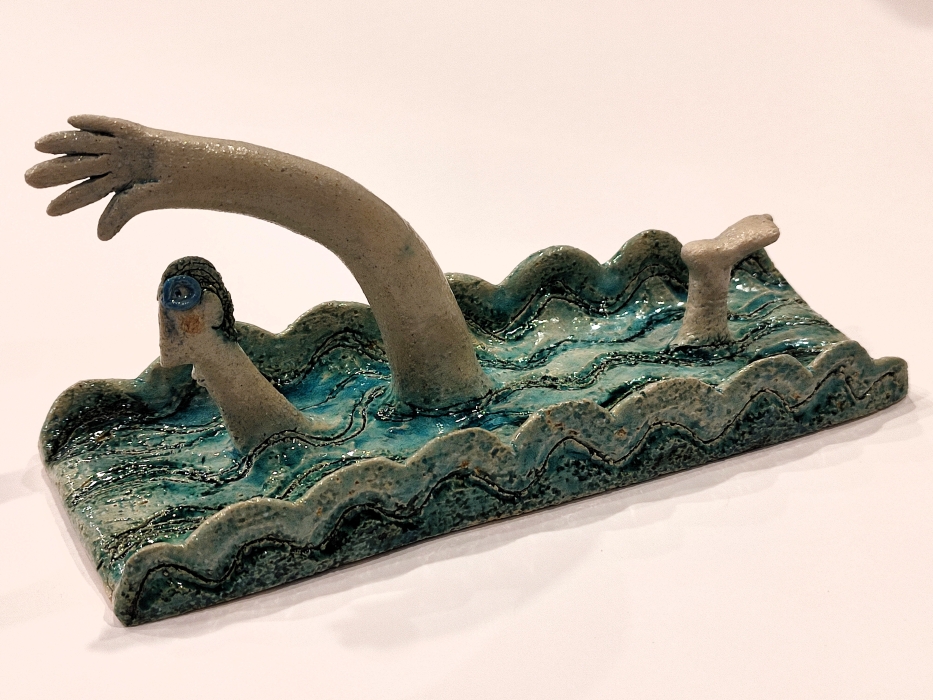 Personaggi che nuotano con grandi bracciate sul pelo dell’acqua.