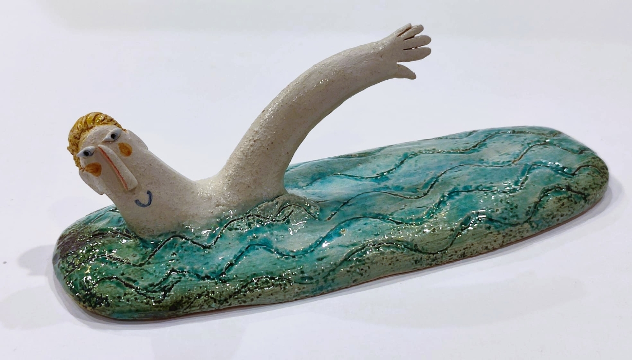 Personaggi che nuotano con grandi bracciate sul pelo dell’acqua.