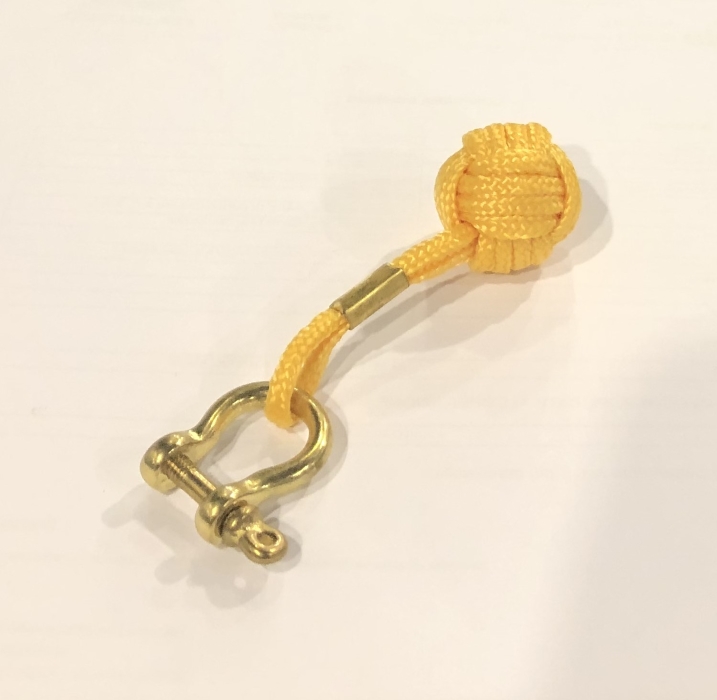 Portachiavi realizzato con cima gialla a forma di un nodo a pugno di scimmia con grillo in ottone.
