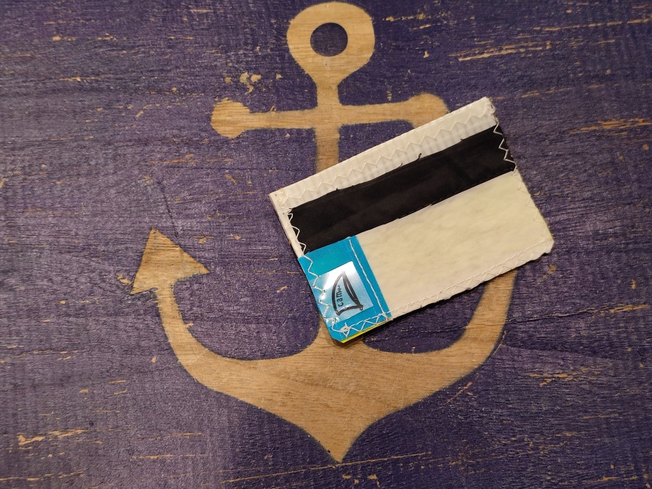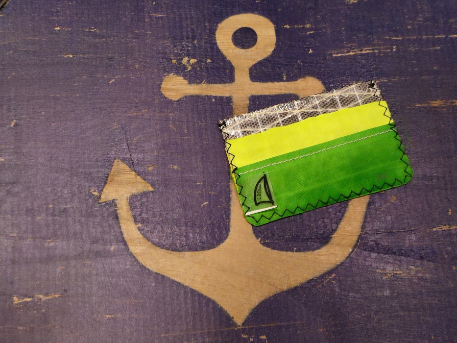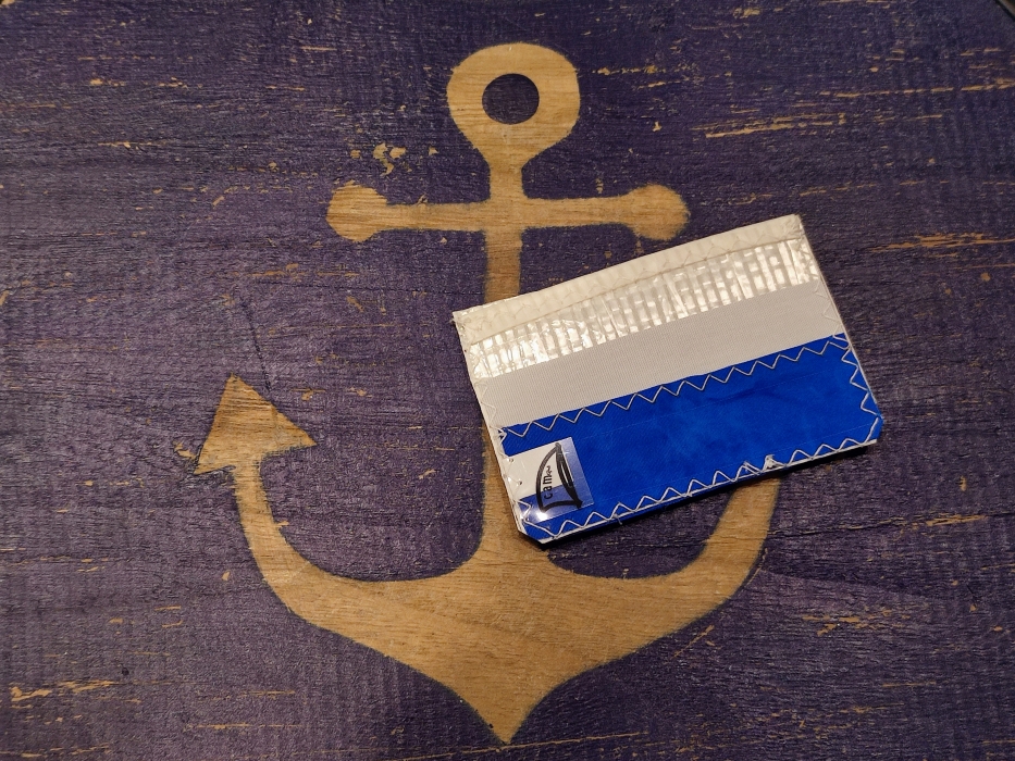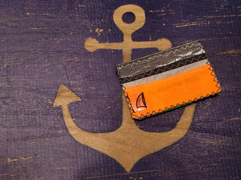 Pezzo della linea di accessori alternativi della Camoz confezionato attraverso il riciclo di vele usate e tagli di tessuto nautico lavorati artigianalmente. I materiali normalmente utilizzati sono: dacron, kevlar, mylar, poliestere laminato, spectra e nylon.