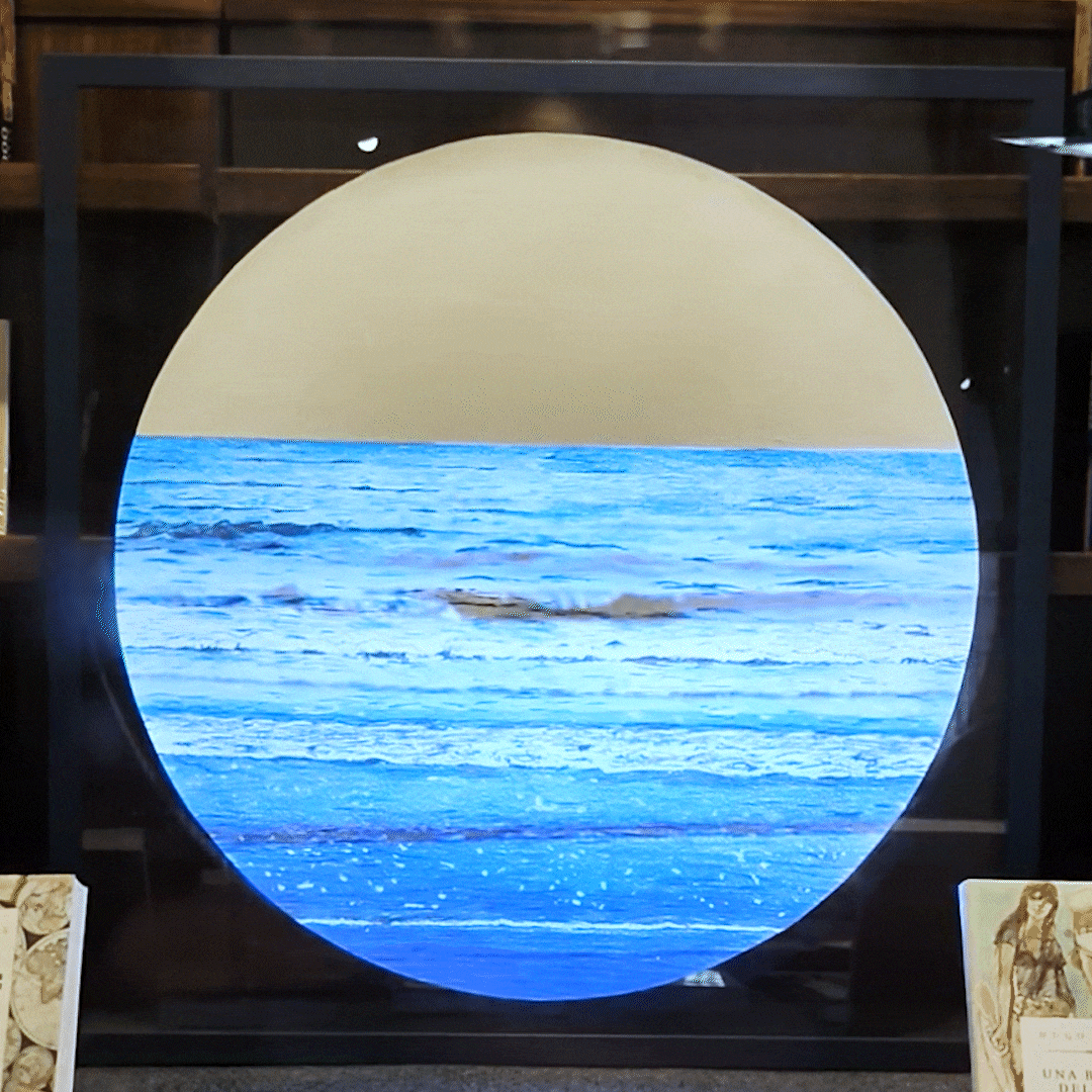 Quadro animato dipinto da Andrea Turla con tecnica mista (penna BIC, matite colorate, acrilico, acquerelli, penna gel e carboncino) su carta da 200 gr. L’originale su carta è applicato su vetro incorniciato (cornice laccata in legno blu opaco). La parte multimediale dell’opera, curata da Giorgia Panizza, consiste nella proiezione in videomapping del movimento delle onde, accompagnato dalla geofonia che caratterizza la costa.