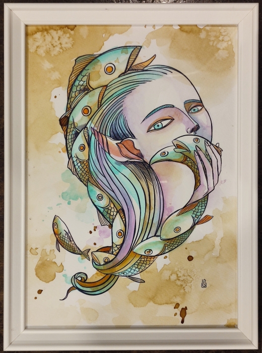 Stampa su cartoncino tinto a macchie di caffè e acquarellata a mano ispirata alla sirena Partenope della mitologia greca.