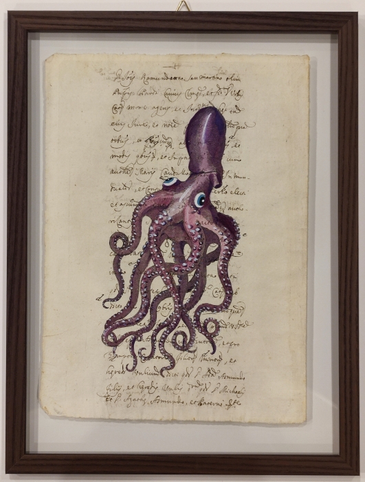 Foglio di carta antica originale con testo recto e verso, su cui è stata impressa con il torchio a mano la riproduzione di una stampa antica, acquarellata a mano da pittori esperti.