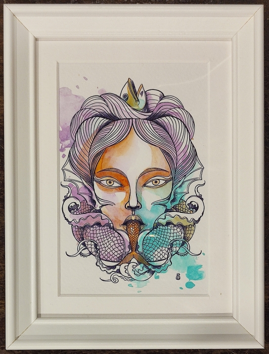 Stampa su cartoncino, acquarellata a mano e ispirata a Thalassa, la personificazione divina e femminile del mare nella mitologia greca.