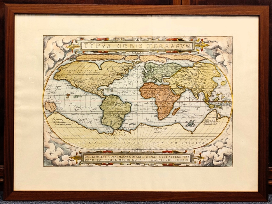 Questa riproduzione di una stampa antica (originale di Ortelio) è stata impressa con il torchio a mano su carta Fabriano e acquarellata a mano da pittori esperti.