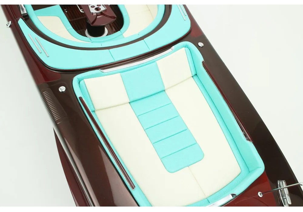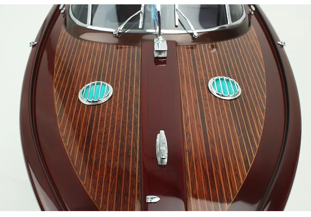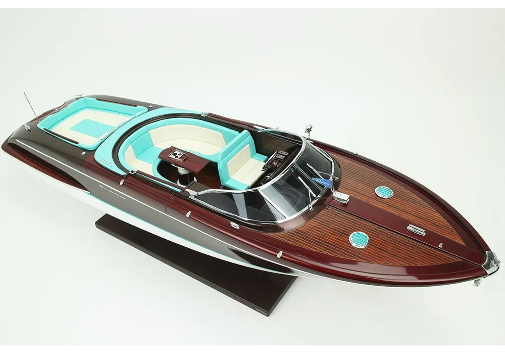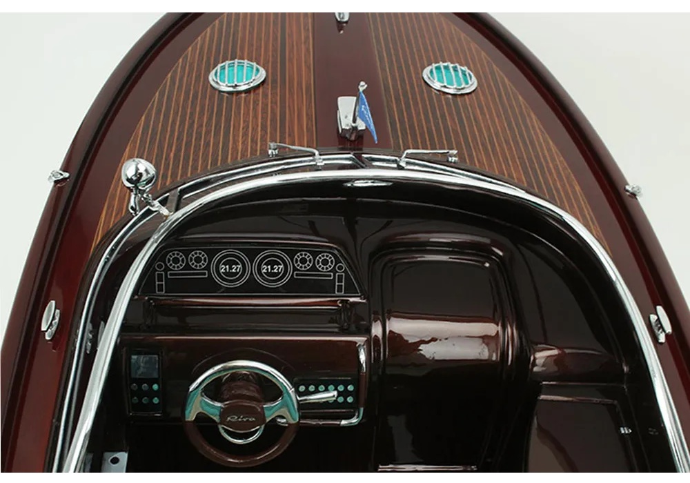 Un oggetto davvero eccezionale: questo esclusivo modello ufficiale del Riva Anniversario è stato creato in collaborazione con il cantiere navale Riva. È una replica fedele del leggendario Anniversario, interamente realizzata a mano con materiali di alta qualità: vera vetroresina e autentici rivestimenti nautici. Tutti gli accessori sono realizzati su misura in ottone cromato da gioiellieri esperti. Vengono applicati dieci strati di vernice per ottenere un’eccellente lucentezza e profondità, per una finitura eccezionale.