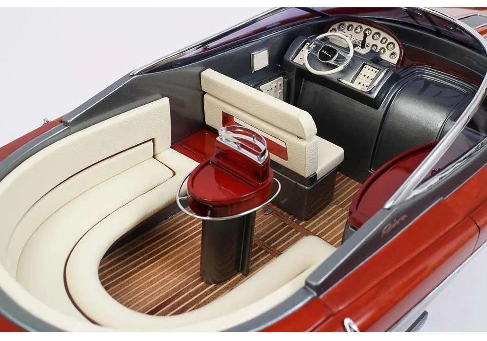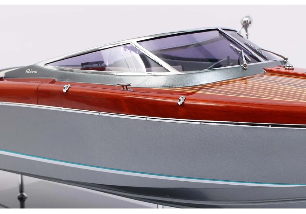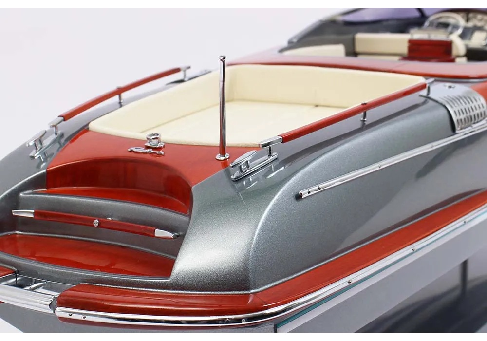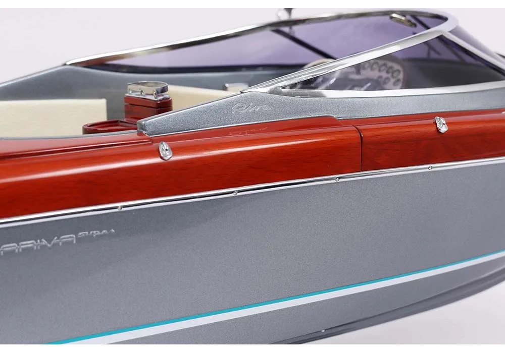 Un oggetto davvero eccezionale: questo esclusivo modello ufficiale del Riva Aquariva Super è stato creato in collaborazione con il cantiere navale Riva. È una replica fedele del leggendario Aquariva Super, interamente realizzata a mano con materiali di alta qualità: vera vetroresina e autentici rivestimenti nautici. Tutti gli accessori sono realizzati su misura in ottone cromato da gioiellieri esperti. Vengono applicati dieci strati di vernice per ottenere un’eccellente lucentezza e profondità, per una finitura eccezionale.