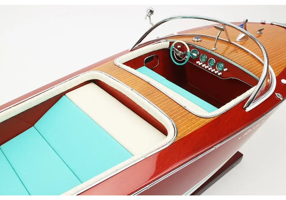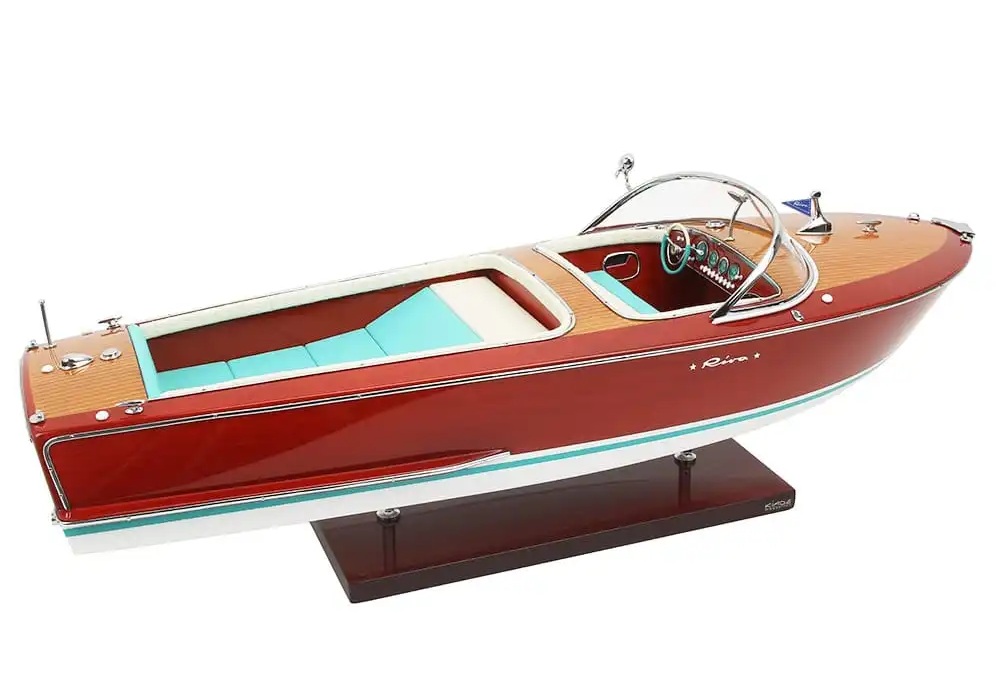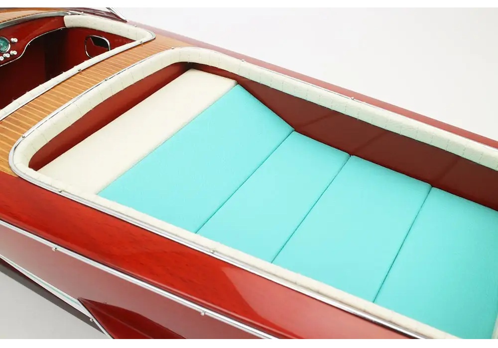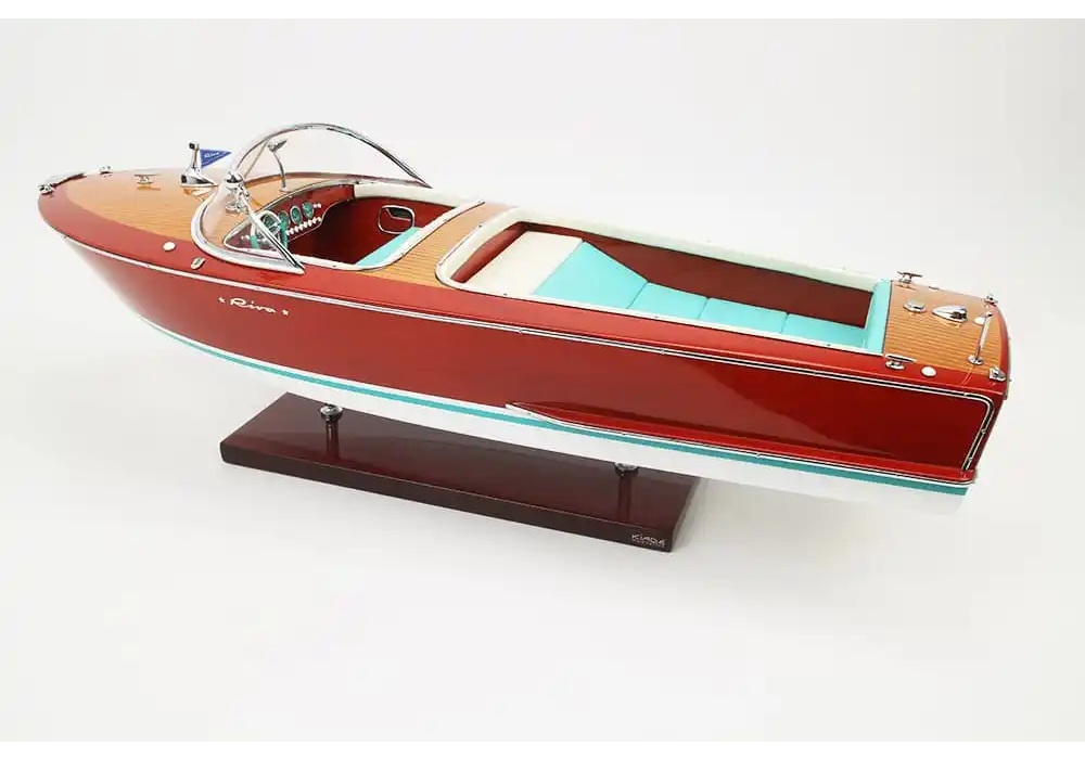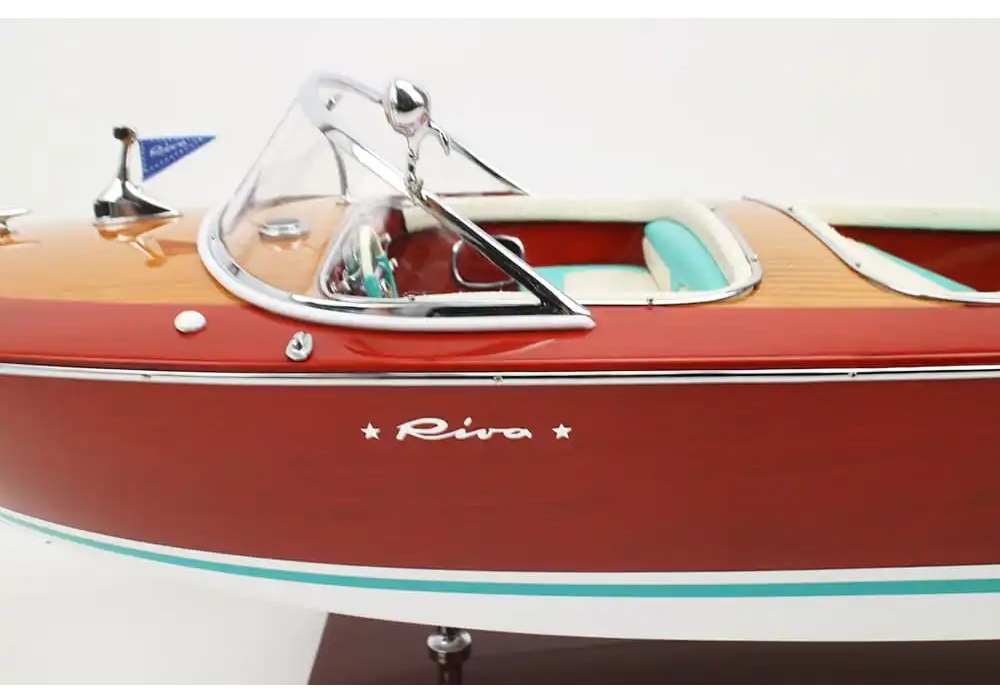 Un oggetto davvero eccezionale: questo esclusivo modello ufficiale del Riva Florida è stato creato in collaborazione con il cantiere navale Riva. È una replica fedele del leggendario Florida, interamente realizzata a mano con materiali di alta qualità: legni pregiati e autentici rivestimenti nautici. Tutti gli accessori sono realizzati su misura in ottone cromato da gioiellieri esperti. Vengono applicati dieci strati di vernice per ottenere un’eccellente lucentezza e profondità, per una finitura eccezionale.