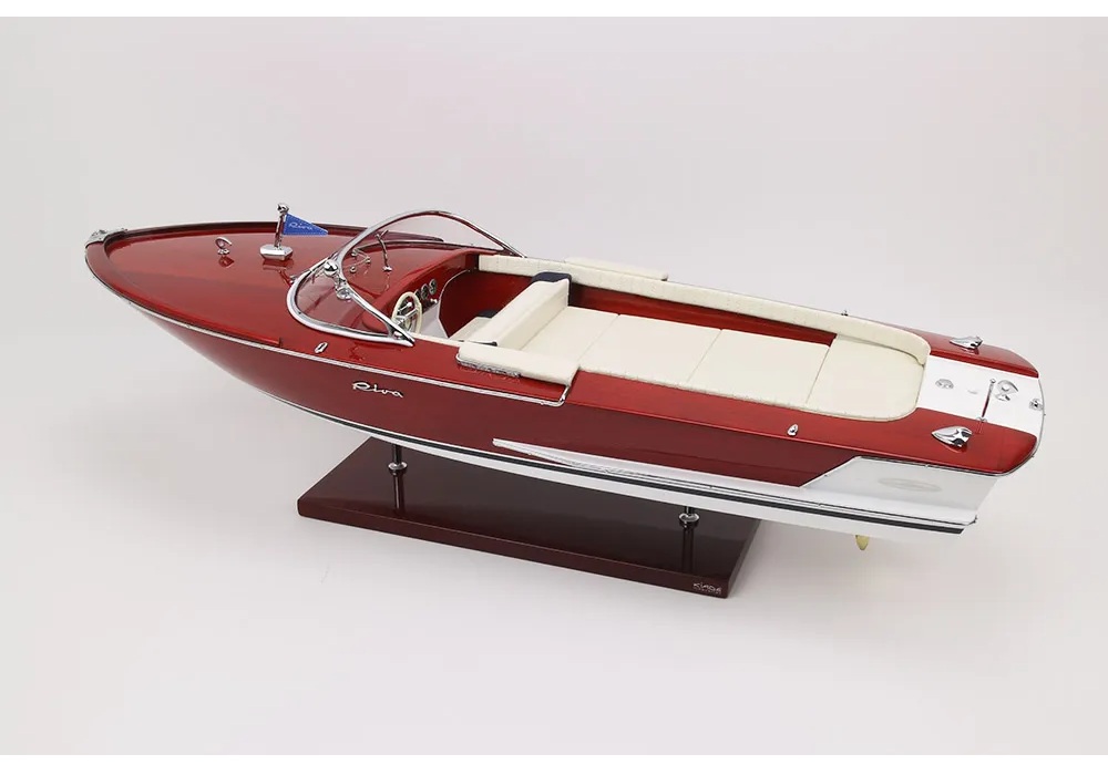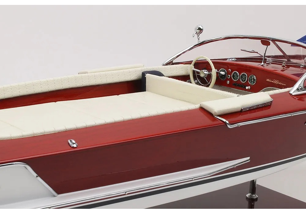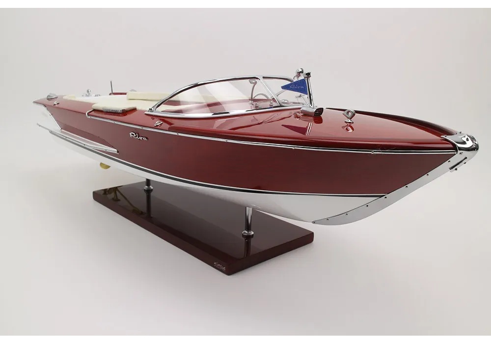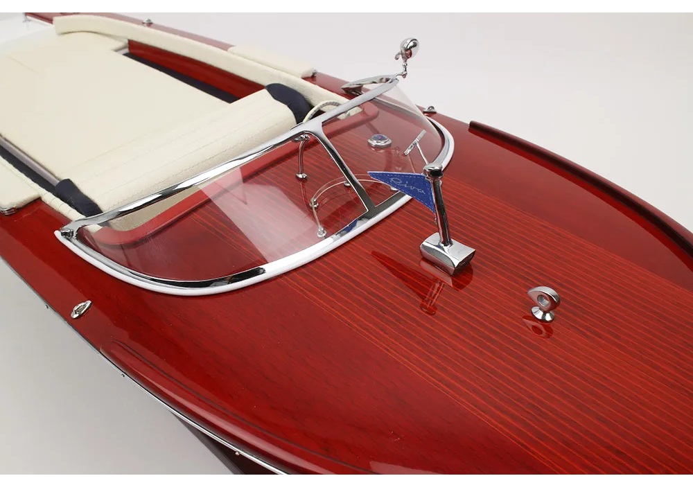 Un oggetto davvero eccezionale: questo esclusivo modello ufficiale del Riva Olympic è stato creato in collaborazione con il cantiere navale Riva. È una replica fedele del leggendario Olympic, interamente realizzata a mano con materiali di alta qualità: legni pregiati e autentici rivestimenti nautici. Tutti gli accessori sono realizzati su misura in ottone cromato da gioiellieri esperti. Vengono applicati dieci strati di vernice per ottenere un’eccellente lucentezza e profondità, per una finitura eccezionale.