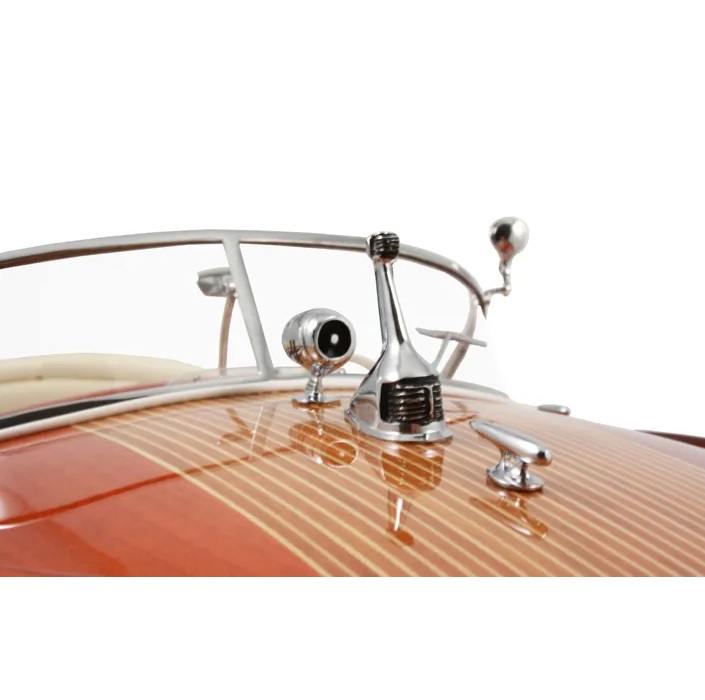 Un oggetto davvero eccezionale: questo esclusivo modello ufficiale del Riva Super Ariston è stato creato in collaborazione con il cantiere navale Riva. È una replica fedele del leggendario Super Ariston, interamente realizzata a mano con materiali di alta qualità: legni pregiati e autentici rivestimenti nautici. Tutti gli accessori sono realizzati su misura in ottone cromato da gioiellieri esperti. Vengono applicati dieci strati di vernice per ottenere un’eccellente lucentezza e profondità, per una finitura eccezionale.
